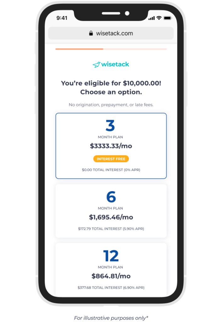 *All financing is subject to credit approval. Your terms may vary. Payment options through Wisetack are provided by our lending partners. For example, a $1,200 purchase could cost $104.89 per month for 12 months, based on an APR of 8.9% or $400 per month for 3 months, based on a 0% APR. Offers range from 0% to 35.9% APR based on amount requested and creditworthiness. Not all merchants and lenders participate in 0% interest programs. State interest rate caps may apply. No other financing charges or participation fees. See additional terms at wisetack.com/faqs.